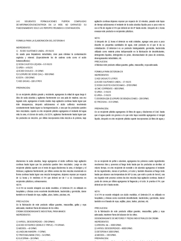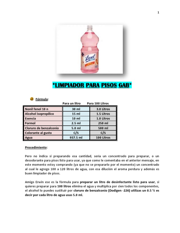 formula para preparar productos de limpieza y otros